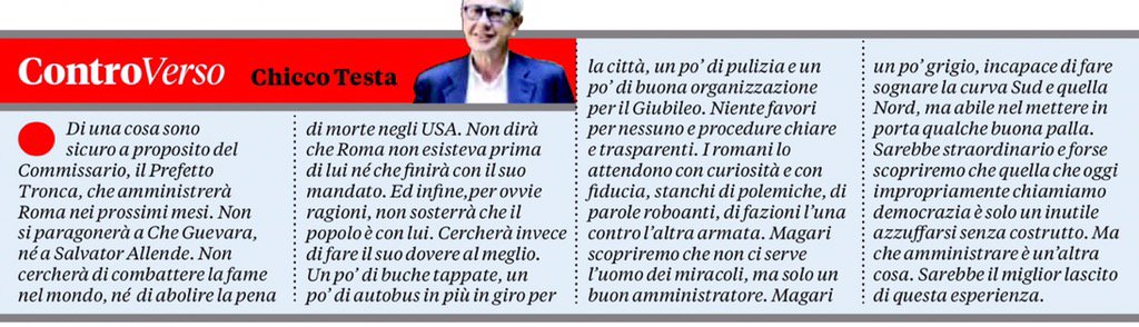 C'è gente anche di una certa cultura che si domanda: ma se la politica fa tutti questi disastri, non è forse meglio affidare tutto ai prefetti, che sono gente a modo e risolvono problemi? Magari un po' grigi ma perlopiù immuni alla demagogia e tutti votati alla buona amministrazione. Se lo domanda Chicco Testa, per esempio, laureato in filosofia presso l'Università degli studi di Milano, sulla sua rubrica sull'Unità. «Quella che oggi impropriamente chiamiamo democrazia è solo un inutile azzuffarsi senza costrutto». E quella che propriamente si dovrebbe chiamare? Una sfilza di prefetti e commissari straordinari assunti per concorso sulla base di rigorosi test psico-attitudinali, altro che democrazia! (d'altronde, l'avevamo detto: pensate davvero che la gente sappia davvero quel che fa e soprattutto quel che è giusto? In fondo Marino l'hanno votato loro).