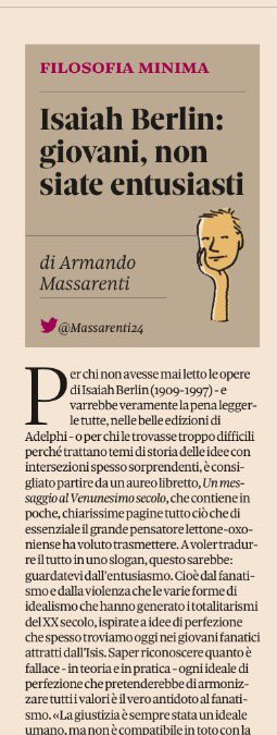 Non ho letto nulla di Isaiah Berlin, non lo conosco, ma quel trafiletto* che mi è capitato sott'occhio su Twitter esprime una verità che non può che trovarmi d'accordo: giovani, non siate entusiasti ("Un messaggio al ventunesimo secolo", Adelphi*). Ovviamente impossibile privare dell'entusiasmo i giovani, alla loro età è fisiologico (per esempio il mio entusiasmo, da giovane, era tutto rivolto alla depressione). Ma noi vecchi saggi lo sappiamo bene che l'entusiasmo appartiene alla famiglia delle suggestioni, soprattutto se abbinato, come pare notare il Berlin, a quell'anelito alla purezza che sfocia nell'ossessione e quindi, eventualmente, nel fanatismo. Per dirla come il mio amico Schopenhauer, i giovani hanno entusiasmo perché la natura deve per forza di cose ingannarli se vuole continuare a perpetuare ostinatamente la vita, e ci riferiamo qui a quel particolare forma di entusiasmo che si chiama "amore". Per cui, tirando le somme, questa grande verità risulta evidente solo dopo la quarantina, ma sarebbe comunque inutile cercare di propagandarla, non verrebbe capita.